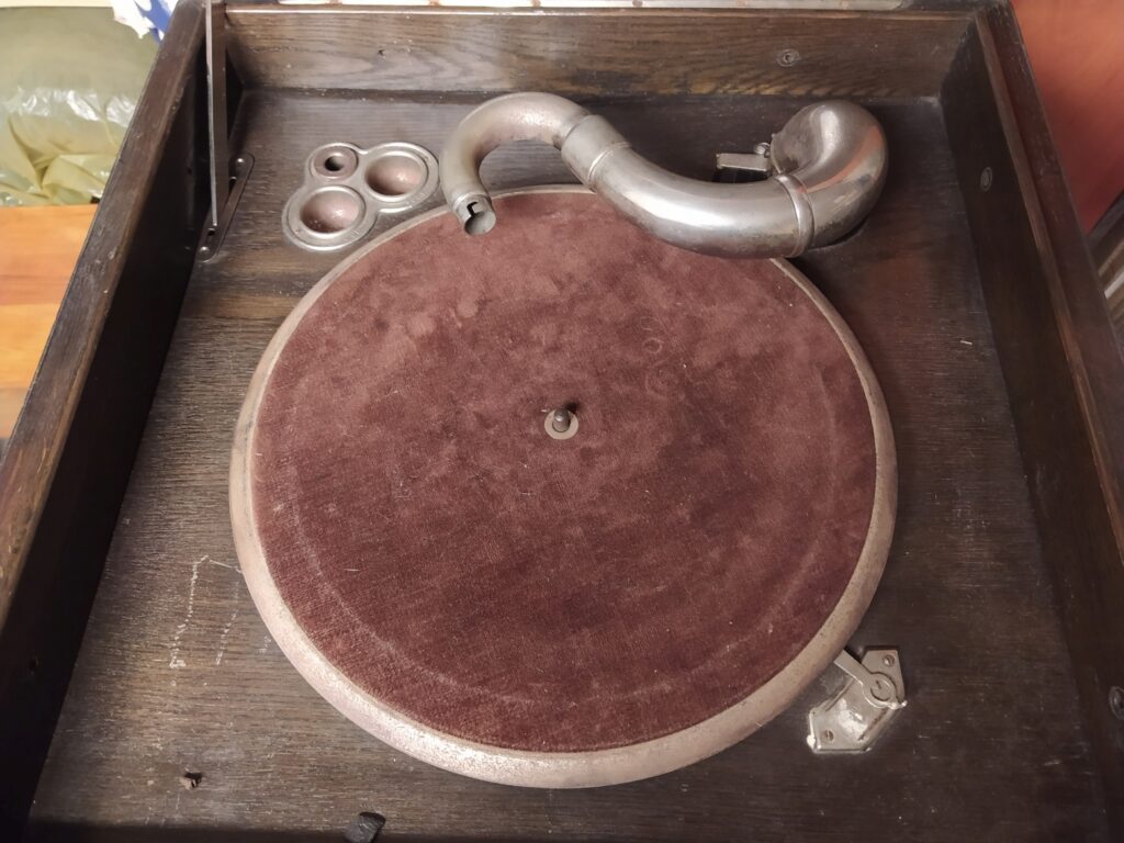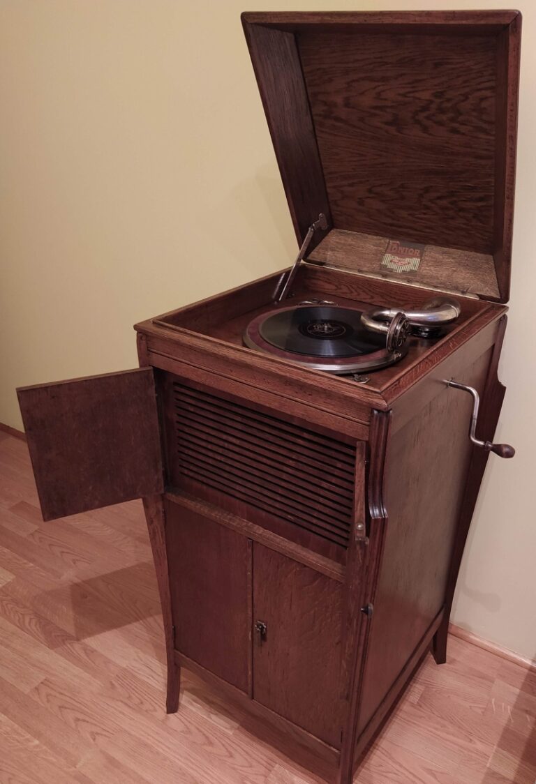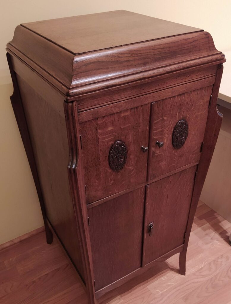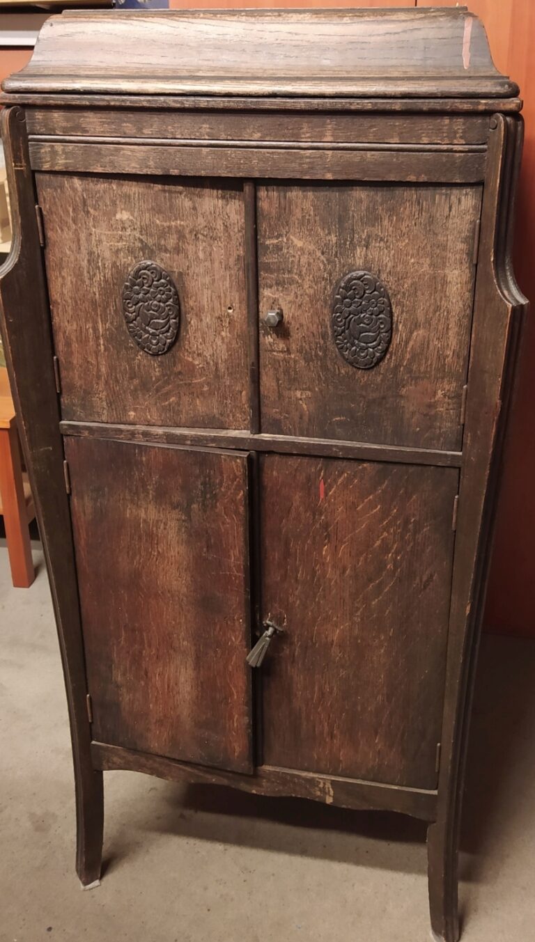 Fonior Wysoki, smukły patefon szafkowy. Górne drzwiczki zamykają tubę, dolne zakrywają półki na płyty Stan przed renowacją. Szafka zniszczona, brakuje tuby oraz kratki zakrywającej wyjście tuby. Moje prace