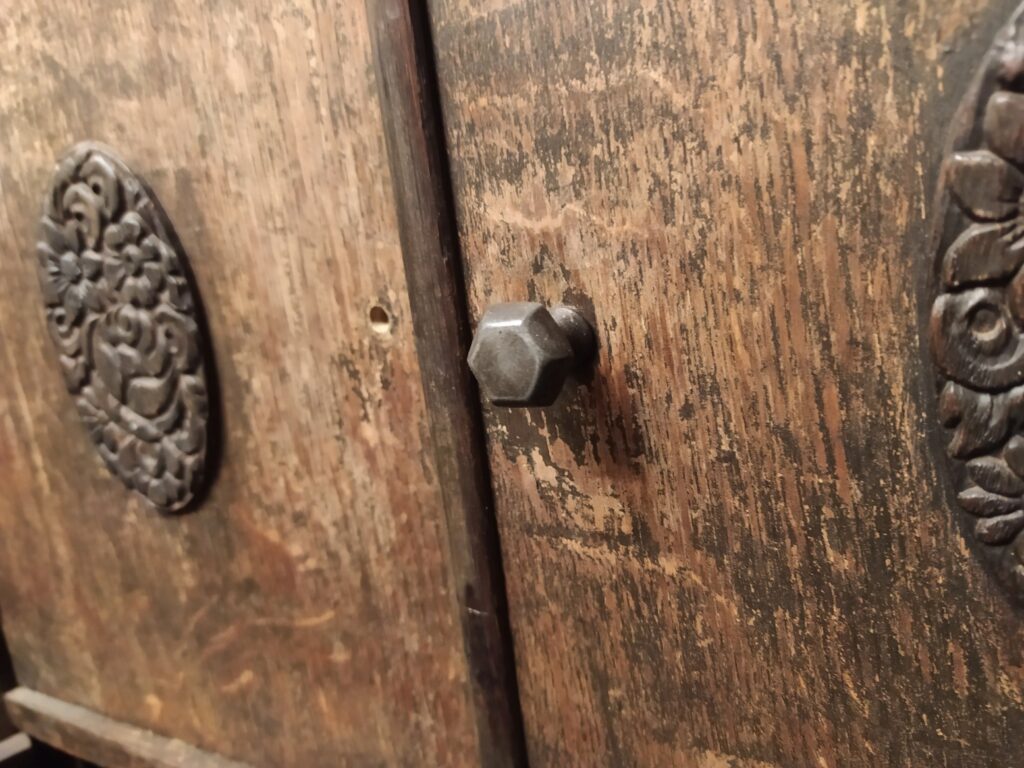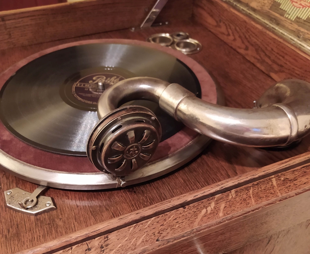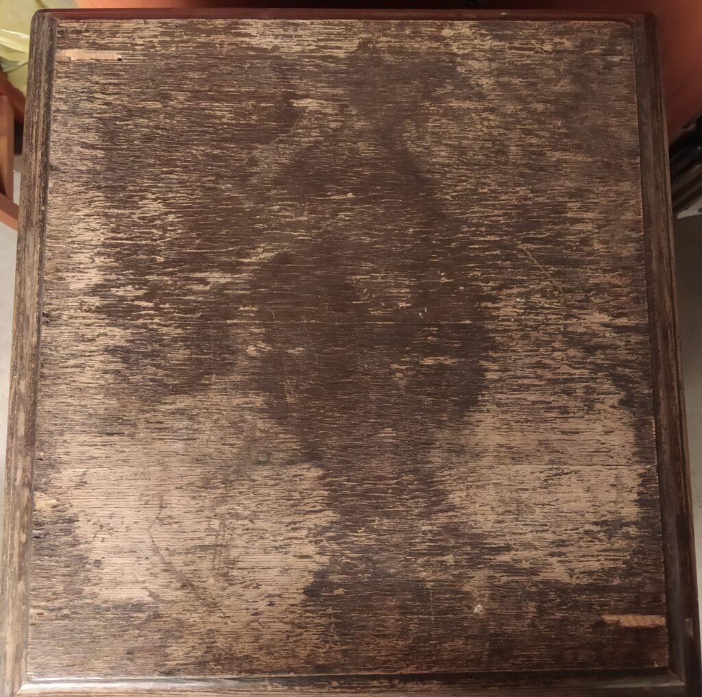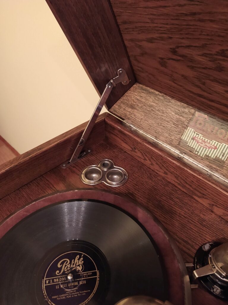 Fonior Wysoki, smukły patefon szafkowy. Górne drzwiczki zamykają tubę, dolne zakrywają półki na płyty Stan przed renowacją. Szafka zniszczona, brakuje tuby oraz kratki zakrywającej wyjście tuby. Moje prace