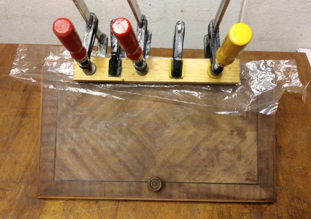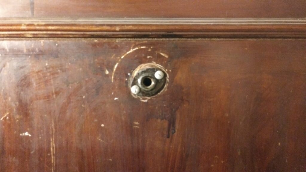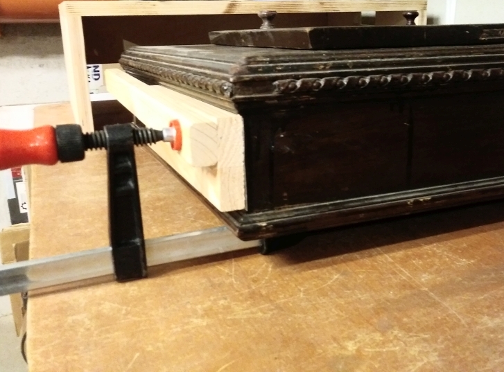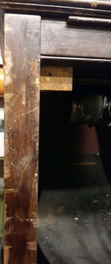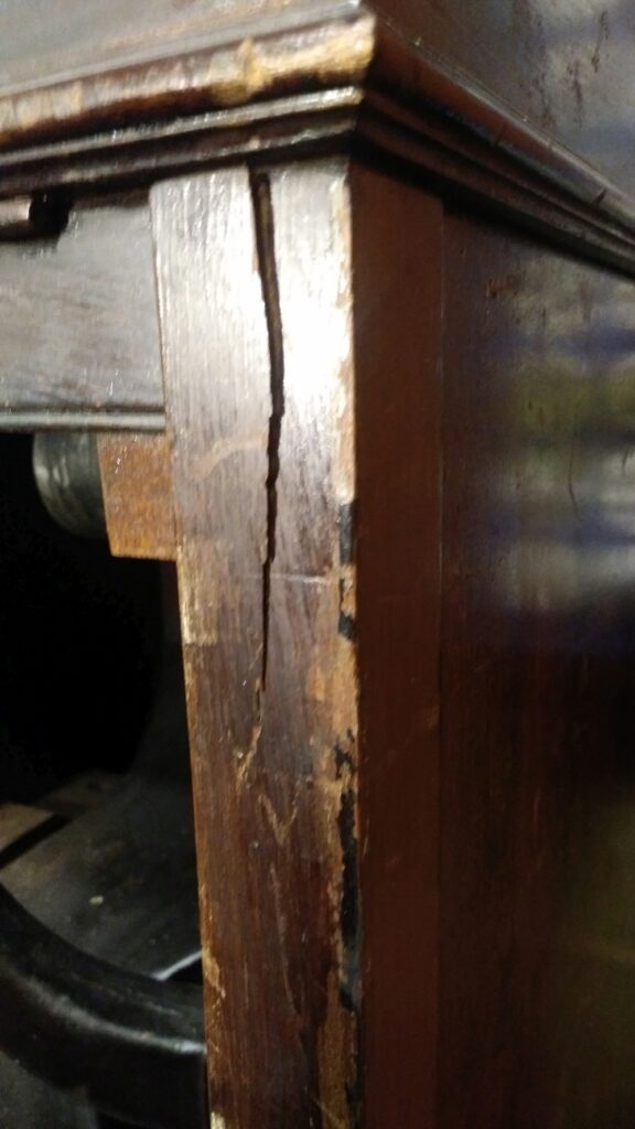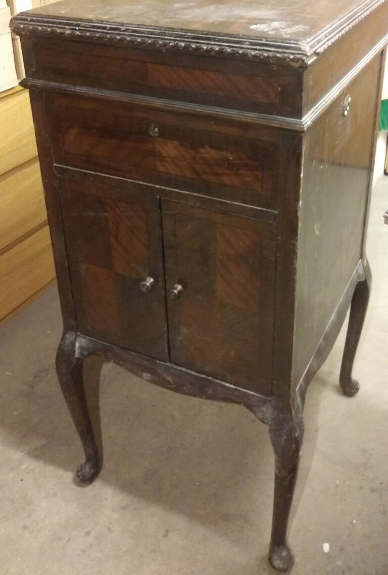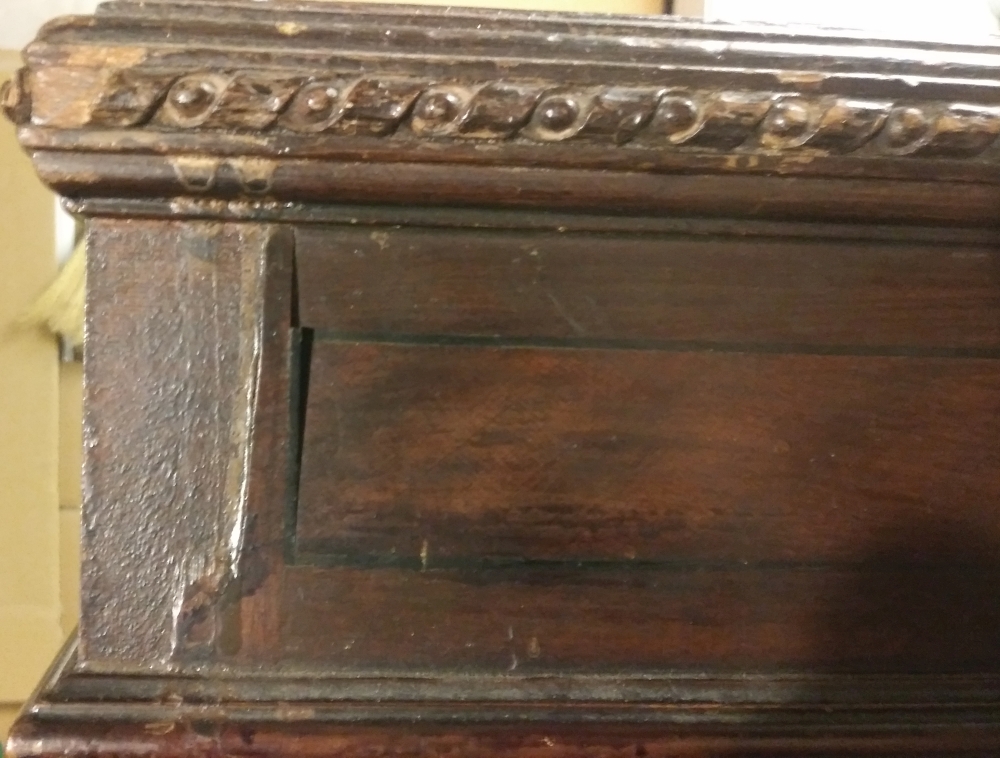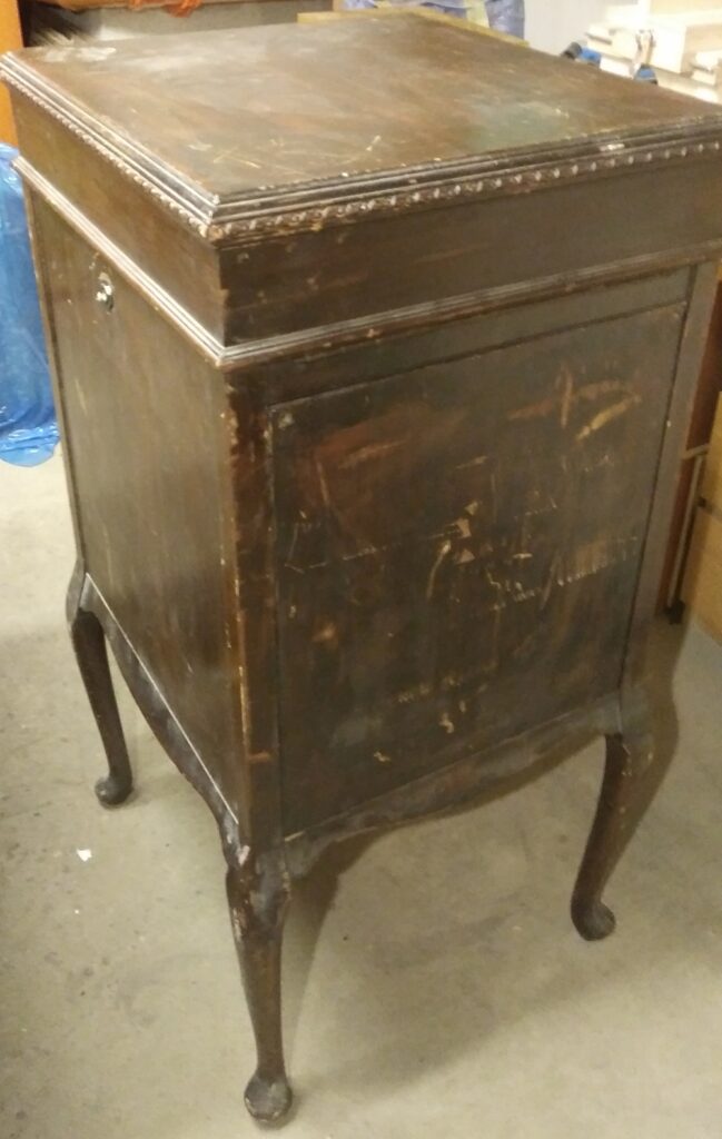 Stan przed renowacją. Zniszczona politura, skrzynia poobijana niemalże ze wszystkich stron.