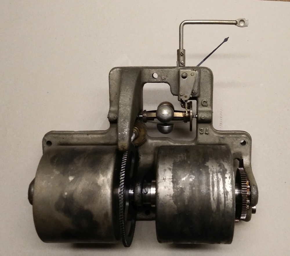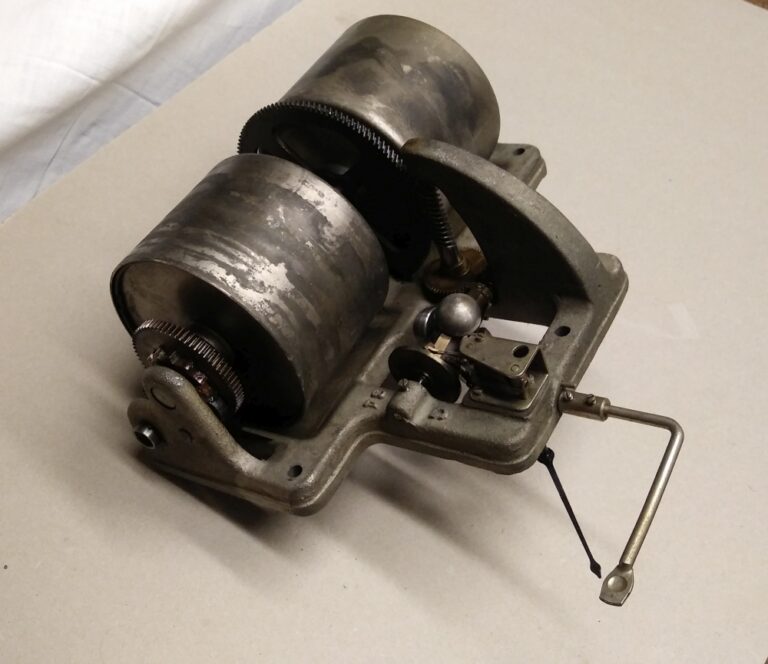 Ogromny mechanizm z dwoma dużymi bębnami zawierającymi sprężyny napędowe. Waży ok. 7 kg.
