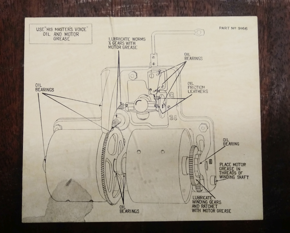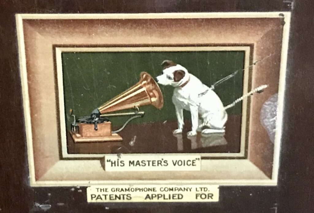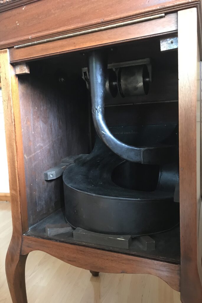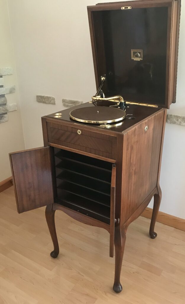 Patefon His Master’s Voice w pięknej fornirowanej skrzyni na ozdobnych nogach. Mechanizm napędzający i tuba mieszczą się w skrzyni. Patefon stoi na podłodze, ma 1,5 m wysokości i waży ok 40 kg.