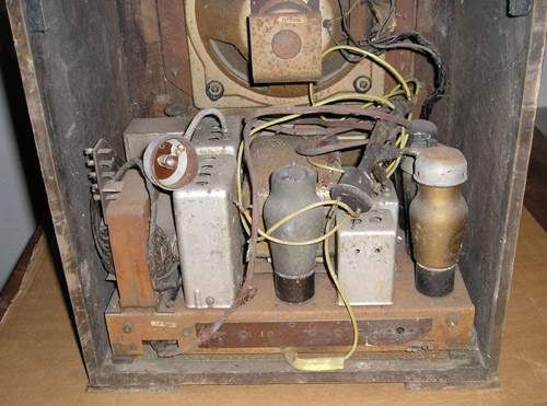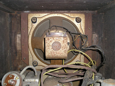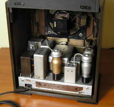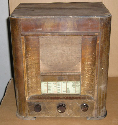 Stan przed renowacją. Skrzynka ogólnie średnim stanie. Drewno mocne i nie zniszczone, ale widać zniszczoną politurę, a w górnej części odchodzi okleina. Tkanina zakrywająca głośnik zmurszała. Lewa gałka nieoryginalna.