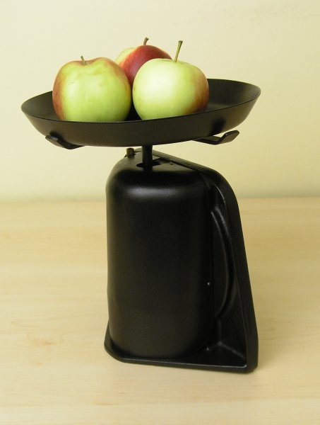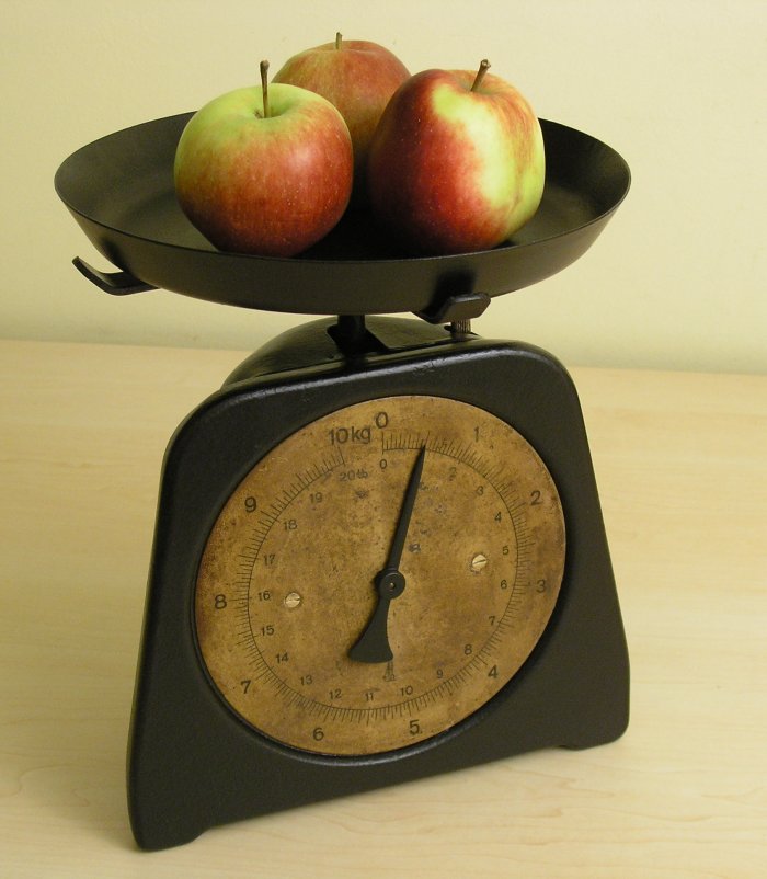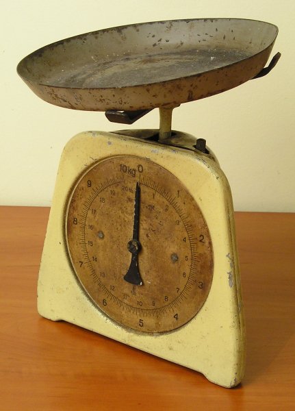 Stara waga kuchenna. Nie wiem dokładnie z jakiego okresu pochodzi, prawdopodobnie z lat pięćdziesiątych. Prosty mechanizm sprężynowy. Maksymalny ciężar ważonych produktów – 10 kg.