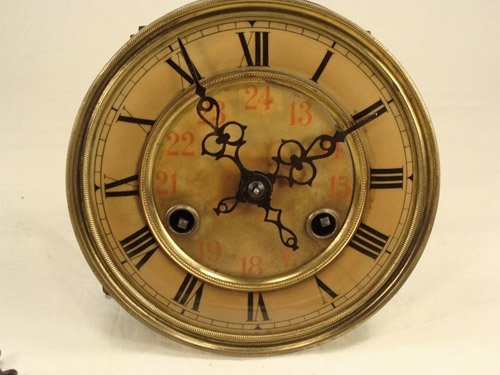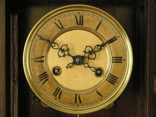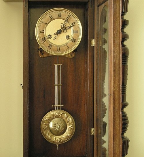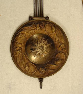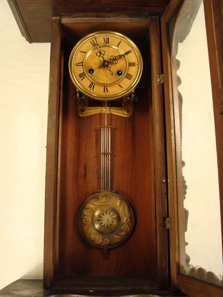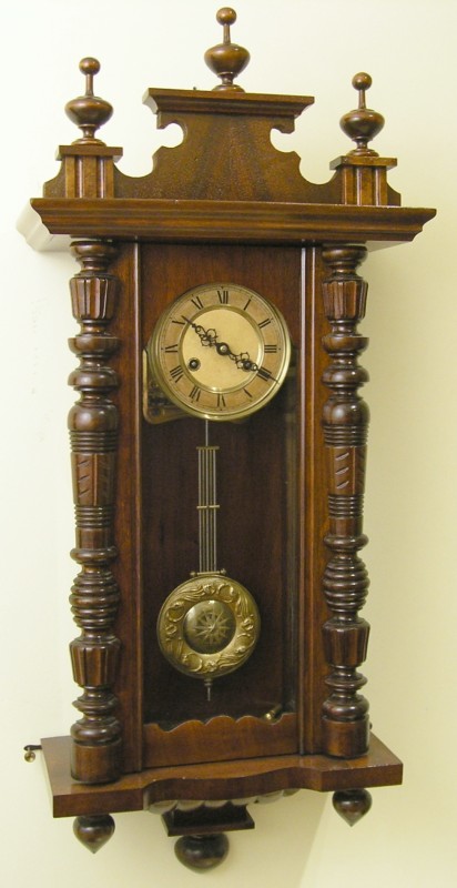 Zegar z wytwórni FMS (Niemcy), lata dwudzieste XXw. Piękna drewniana skrzynka w kolorze palisander, bogato zdobione tralki, wahadło z soczewką z motywem słoneczka słoneczka.