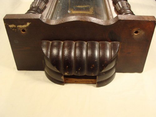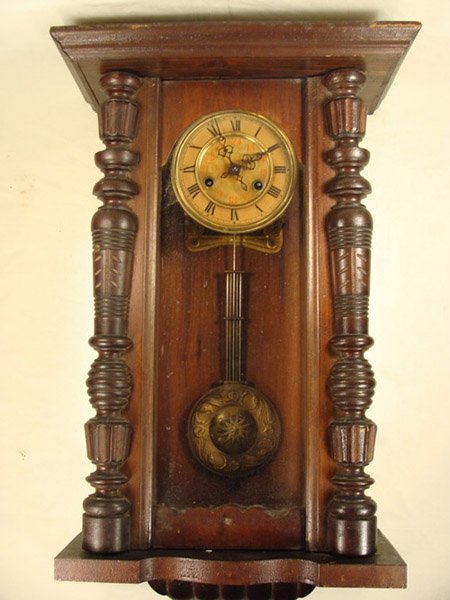 Zegar przed renowacją. Ogólnie w dobrym stanie. Drewno nie zniszczone, wymaga odnowienia politury.