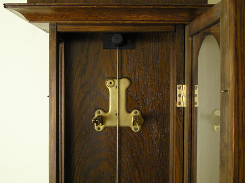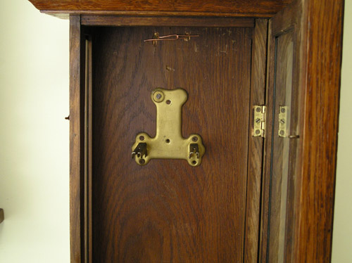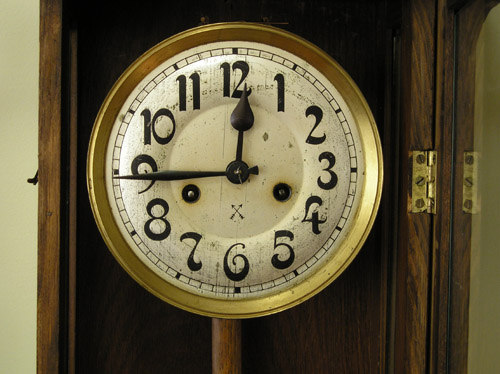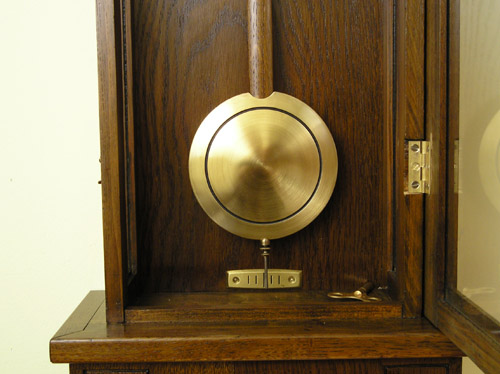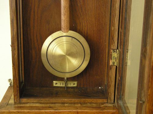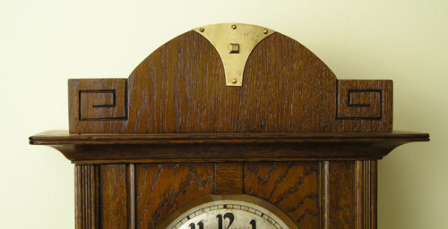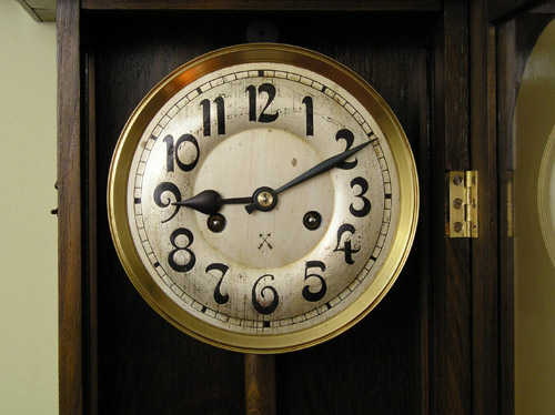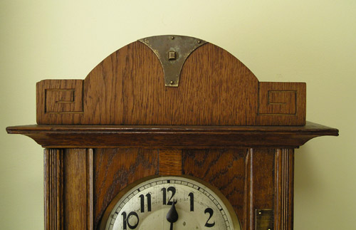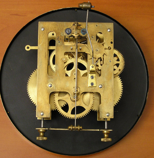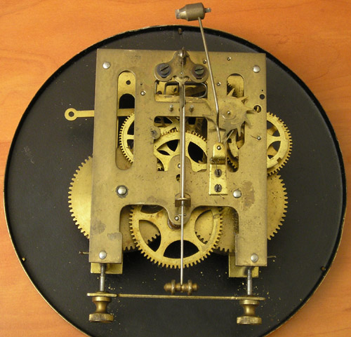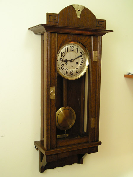 Zegar HAU Zegar z wytwórni HAU Hamburg Amerikanische Uhrenfabrik (Niemcy), lata trzydzieste XXw. Drewniana skrzynka, drzwiczki dębowe, mosiężne dekoracje. Zegar przed renowacją. Ogólnie w dobrym stanie, skrzynia nie zniszczona , ale poczerniały mosiądz , wyrwany gong, przybrudzona tarcza. Braki listewek Tarcza do wyczyszczenia I po czyszczeniu. Górna część zegara. Odłamany lewy narożnik, zaśniedziałe dekoracje, brak połysku Tutaj po czyszczeniu i patynowaniu. Nowa politura Wahadło przed renowacją … i po renowacji Mechanizm wygląda całkiem nieźle, niestety ma poważne uszkodzenie – zerwaną sprężynę. Po naprawie wygląda tak samo z tą różnicą, że działa. Moje prace