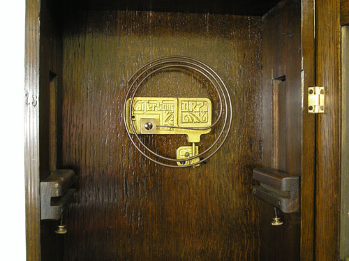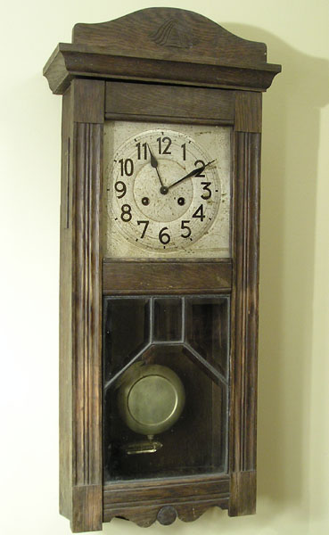 Zegar z wytwórni Jungans (Niemcy), lata trzydzieste XXw. Piękna drewniana skrzynka, drzwiczki dębowe, szkło witrażowe.