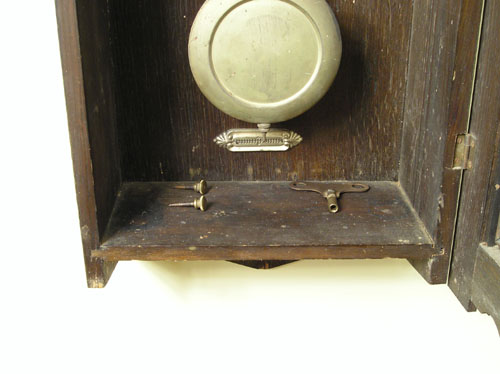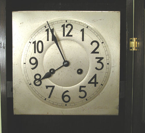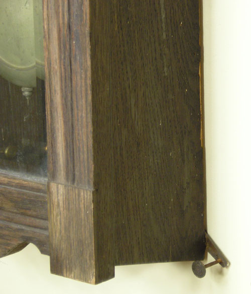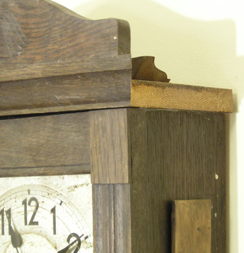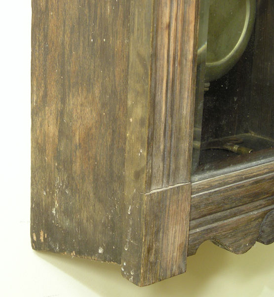 Zegar przed renowacją. Ogólnie w nie najlepszym stanie. Liczne ślady działalności robaków. Tarcza skorodowana. Zegar mocno zakurzony. Politura „wyparowała”, połysk także.
