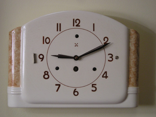 Zegar z wytwórni HAU Hamburg Amerikanische Uhrenfabrik (Niemcy), lata trzydzieste XXw. Tarcza porcelanowa. Jest to zegar typu chodzik – nie wybija godzin.