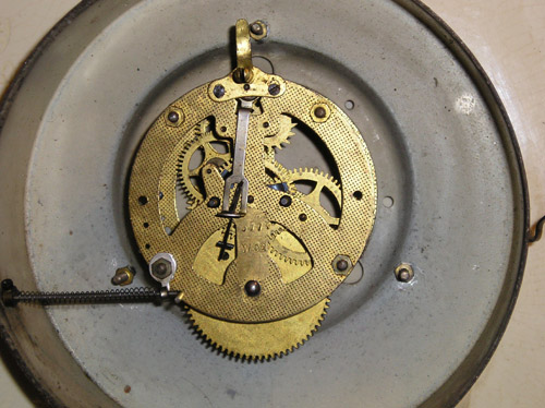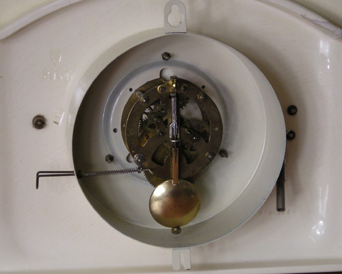 Zegar po czyszczeniu. Wahadełko naprawione, gotowy do pracy. Po prawej stronie widoczny kluczyk, a ten drut ze sprężynką po lewej to „rozrusznik”. Po zawieszeniu na ścianie nie ma dostępu do wahadełka, a żeby zegar ruszył trzeba je popchnąć. Do tego celu służy ten „rozrusznik”