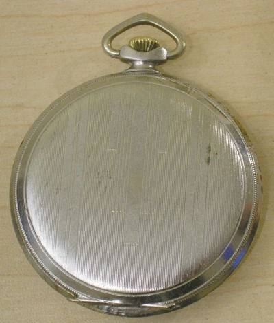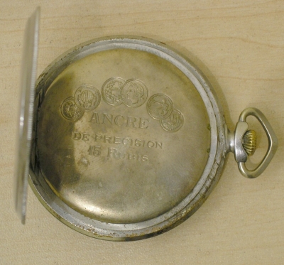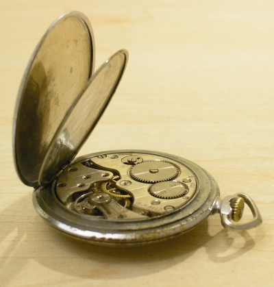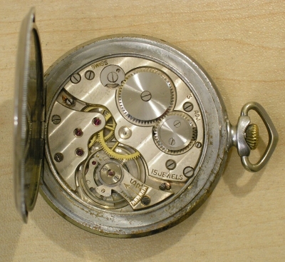 Zegarek kieszonkowy. Wiek i kraj pochodzenia nieznany. Mosiężna niklowana koperta, w wielu miejscach poprzecierana.
